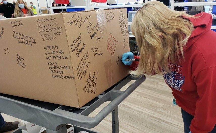 Local 292 GM workers sign boxes of first ventilators shipped to help with the COVID-19 pandemic