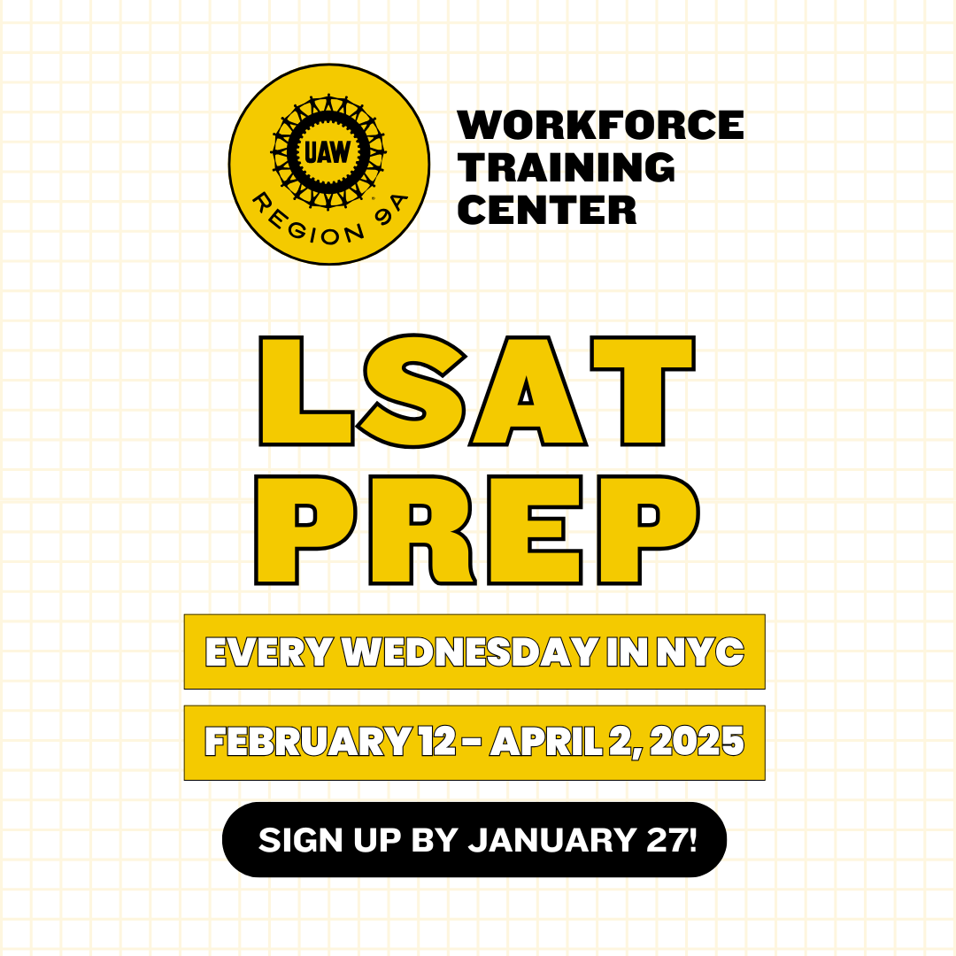 As our inaugural course, we will be offering an 8-week intensive LSAT prep course for members and their families who plan to attend law school (see details below). When offered by for-profit institutions, these courses can cost students $2,000 or more—but through the Workforce Training Center, you will have the opportunity to take this course for free with other UAW members. As we represent hundreds of paralegals and other legal services workers in Locals 2320, 2325, and 2110 as well as undergraduate student workers, we believe this first course will be a great opportunity for members looking to go to law school and return as attorneys working in UAW-represented legal services organizations.