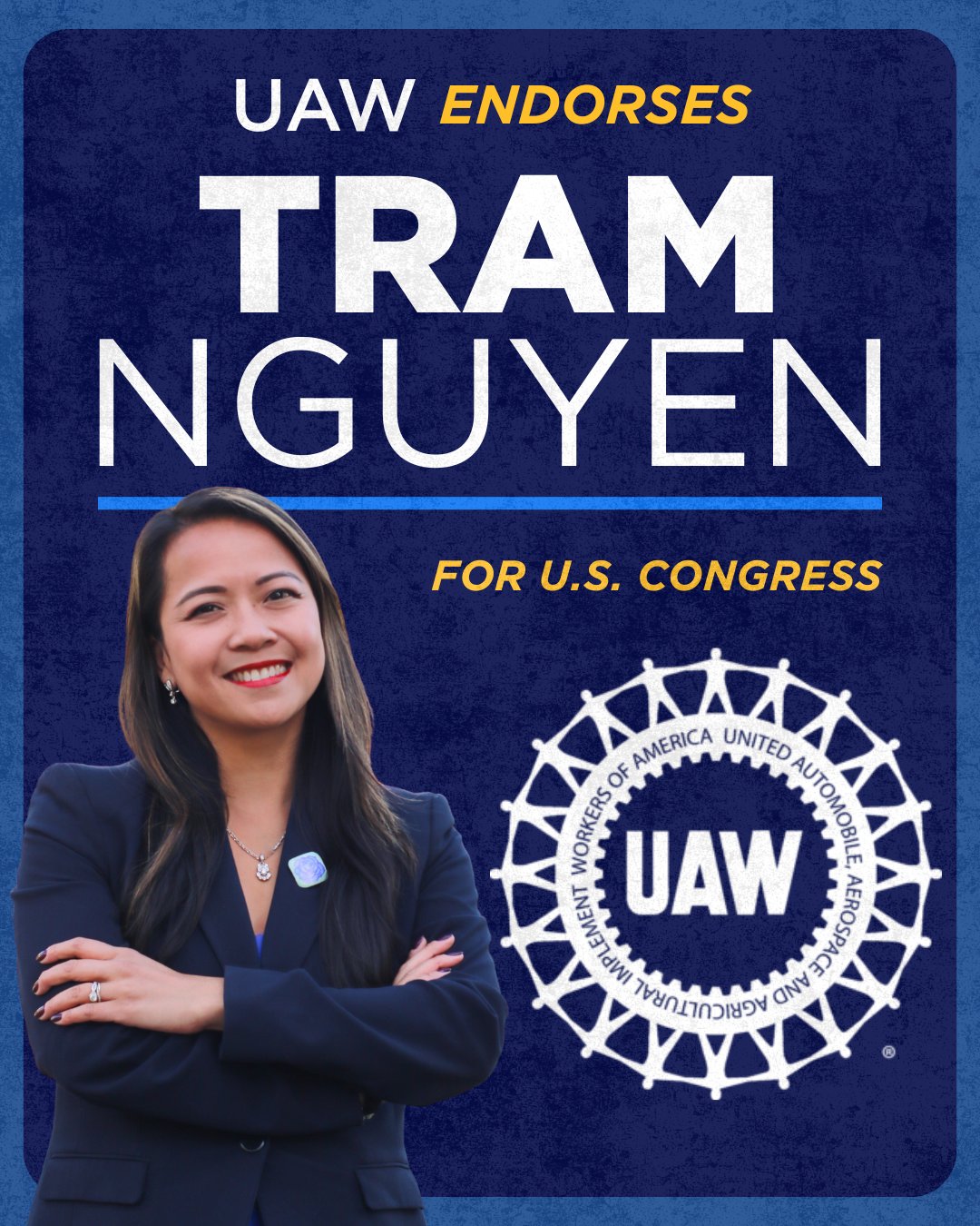 “Congress needs new energy and new leadership. We know Tram, first as a UAW 2320 member, now as a State Representative, and we know her record fighting for issues affecting working people,” said Brandon Mancilla, UAW Region 9A Director. “She will stand with UAW and with working families.”